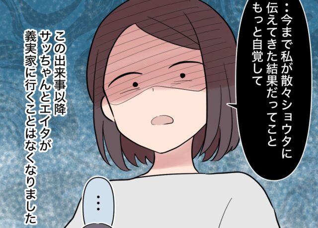 家族に見放されていることにようやく気付いた夫 私と子ども達が義実家に顔を出さなくなって数年。ショウタは私達が義両親と音信不通だと思っていたようですが、実は義父とだけは連絡を取り合い時々会っていました。サッちゃんから初めて […]