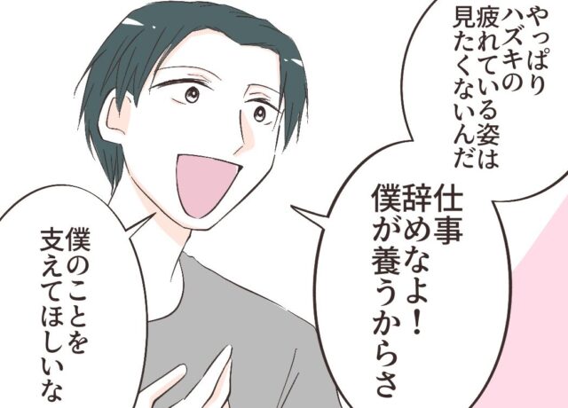 結婚を前提としてお付き合いしていたハズキさんとリヒトさん。ある日「自分を高めることを優先したい。子どもができてもその生活を変えるつもりはない」とリヒトさんに言われ戸惑うハズキさん。「結婚したら専業主婦になって僕を支えてほしい」というリヒトさんの言葉を受け入れましたものの、プロポーズするリヒトさんの言葉が、「僕が」「僕を」と自分のことばかりなのがとっても気がかりでした。