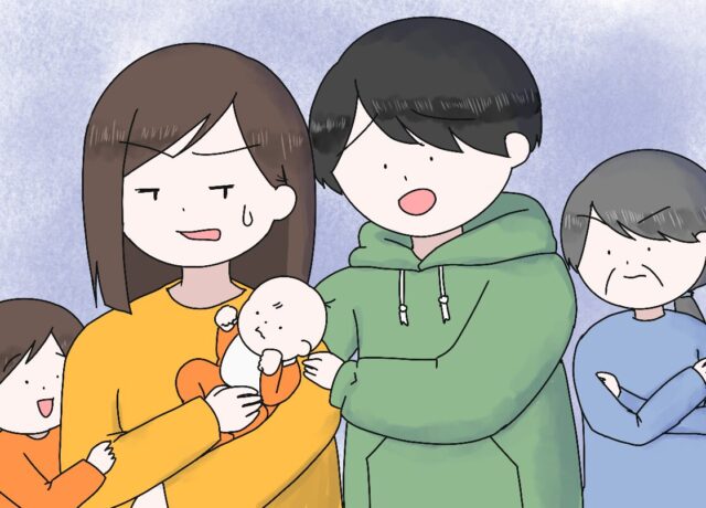 ヨウコは3歳ソウマと産まれたばかりのタクマ2児の母。毎日子どもたちのお世話でバタバタですが、夫マサオは髪を乾かすのも、翌日に着る服を選ぶのも妻にやってほしい、むしろしてもらって当然な態度です。それだけでもモヤモヤするヨウコですが、さらに厄介なのが、毎日なぜかスピーカーで夫と電話をする過保護な義母の存在でした。