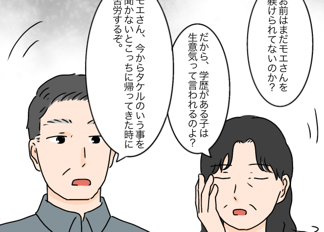 モエは勉強したいことがあって大学院まで学問を追求し、卒業してから29歳で3つ年下のタケルと結婚しました。ところが夫タケルの実家には女性蔑視の考えが根強く残っている問題がありました。義両親は大学院を出ているモエのことをなにかと「女が大学まで出てるから夫の言うことを聞かない」「こんな年まで結婚できない」「嫁を躾けないと大変」などと発言する一方で、タケルも実家に戻ると急にもえさんのことを「コイツ」呼び。明らかにエラそうな態度をとるのでした。