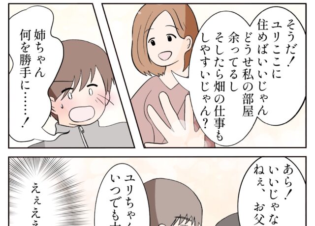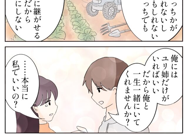 実家暮らしで独身の公輔は26歳。公務員として働いていますが、実家の農家を継ぐべきか悩んでいました。ある日、2歳上で幼馴染のユリが離婚して地元に帰ってきたと知ってドキッとする公輔。学生の頃からおっとりした性格で優しいユリは、公輔の初恋の人だったのです。兄夫婦のもとに身を寄せるも仕事がなく居心地の悪そうなユリに、公輔の両親と姉の早絵は農家を手伝ってもらう提案をしつつ、なんだかニヤニヤ・・・3人の思惑通り、ユリと公輔の関係は恋に発展するのでしょうか?