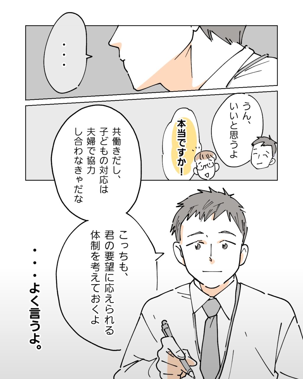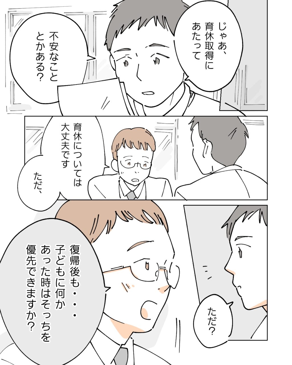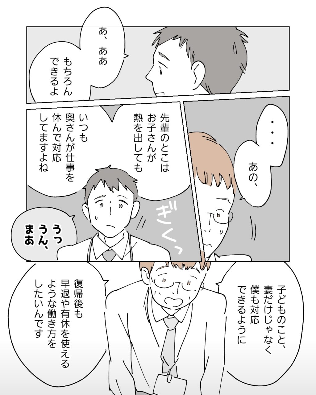 「もちろんできるよ」と答えると、「・・あの、先輩のとこはお子さんが熱を出してもいつも奥さんが仕事を休んで対応してますよね」と言いにくそうに言いました。いつもちひろに任せていることを後ろめたく思っていた俺は、痛いところを突かれて気まずさを覚えながら「うっ、うん、まぁ」と言うと、部下は「子どものこと、妻だけじゃなく僕も対応できるように復帰後も早退や有休を使えるような働き方をしたいんです」と言いました。
