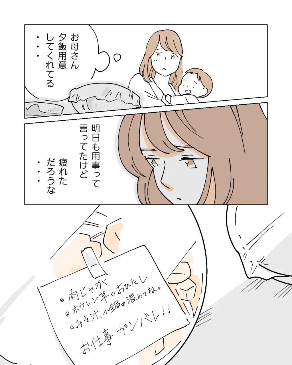 お母さん、夕飯用意してくれてる・・。明日も用事って言ってたけど、疲れただろうな・・。テーブルに近づくと、おかずにかけられたラップに1枚のメモが貼ってあるのが目に入りました。メモには夕飯のメニューが書いてあり、一番下には「お仕事ガンバレ!!」のメッセージ。