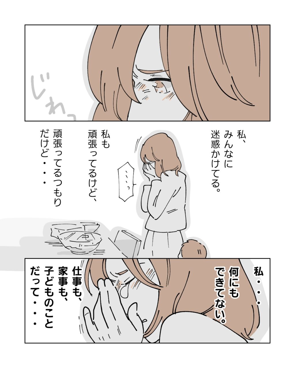 お母さん、翔のお世話をしながら夕飯を作るの大変だっただろうな。急なお願いにも関わらず朝早くから来てくれて、休む間もなく夜遅くに急いで帰って行った母。疲れてるだろうに私のために無理して頑張ってくれたんだろうな・・。こんなに負担をかけているのに私を気遣ってくれる母を思うと涙がこみ上げてきました。私、みんなに迷惑かけてる。私も頑張ってるけど、頑張ってるつもりだけど・・。でも、私・・何もできてない。仕事も、家事も、子どものことだって・・。