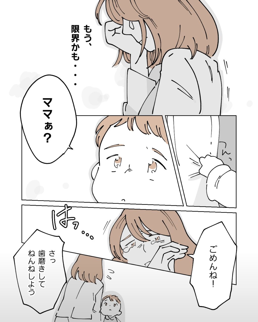 もう、限界かも・・。母にも同僚にも迷惑をかけながら働いても、子育ても仕事も家事も・・すべてが中途半端にしかできていない私。こんな状況でこのまま仕事を続けるのは無理かもしれない。涙が溢れて止まらない私を「ママぁ?」と心配そうに翔が見上げていました。翔の声にハッとした私は慌てて涙を拭いて「ごめんね!さっ、歯磨きしてねんねしよう」と笑顔を作りました。