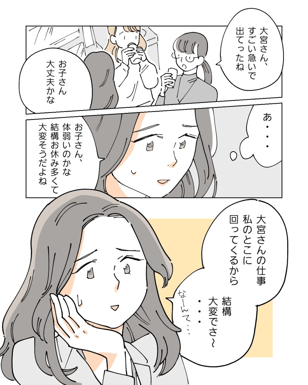 その日の休憩中、同じ部署のワーママである大宮さんの話題になりました。「大宮さんすごい急いで出てったね、お子さん大丈夫かな」そう話す同僚に、私は「お子さん体弱いのかな、結構お休み多くて大変そうだよね」と相づちを打ちつつ、ついでに仕事の愚痴を口に出してみました。