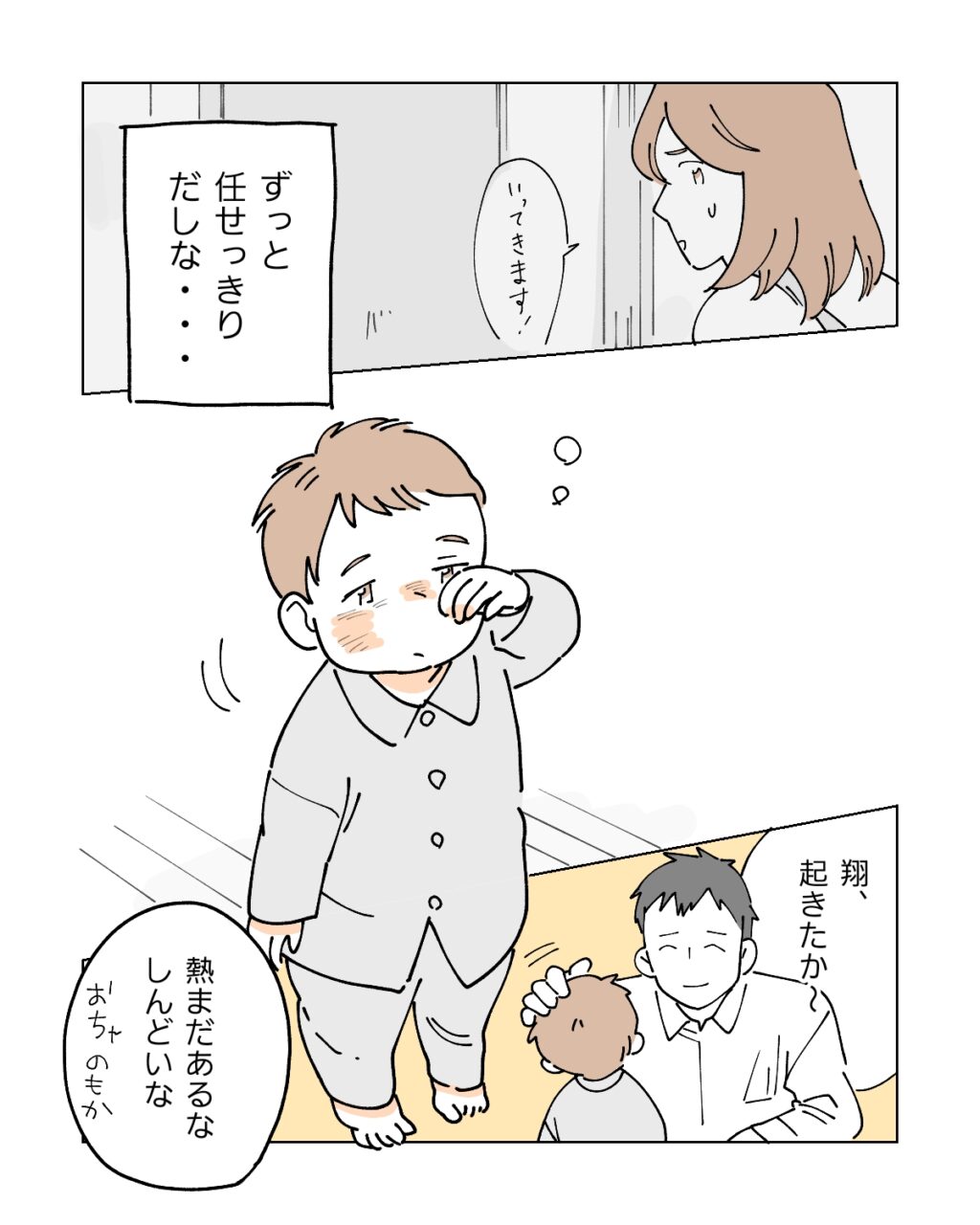 翌朝、やっぱり翔の熱は下がりませんでした。ちひろに「ねぇ、やっぱり今日は休めない?」と聞かれましたが、部下をまとめる立場である以上、急に休むなんてまわりにどれだけ迷惑がかかるか・・・。俺はちひろに、お義母さんに来てもらえないか頼みました。本当はすぐ出勤して少しでも仕事を片付けたいけど、俺もちひろも休めないなら仕方がありません。