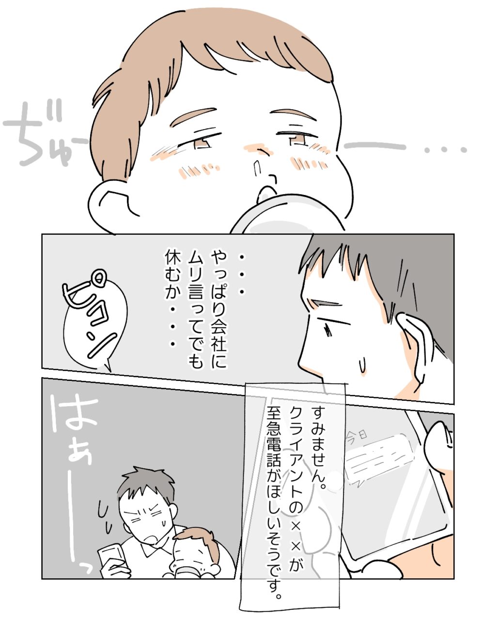 熱のせいで体が辛いのか、翔はうつろな目でお茶を口に運びます。その姿を見ていると、この子を置いて家を出ていいのかという不安が募り、やはり会社に無理を言ってでも休もうかという考えが頭をよぎります。そんな時部下から「すみません、クライアントが至急電話を欲しがっています」と連絡が入りました。