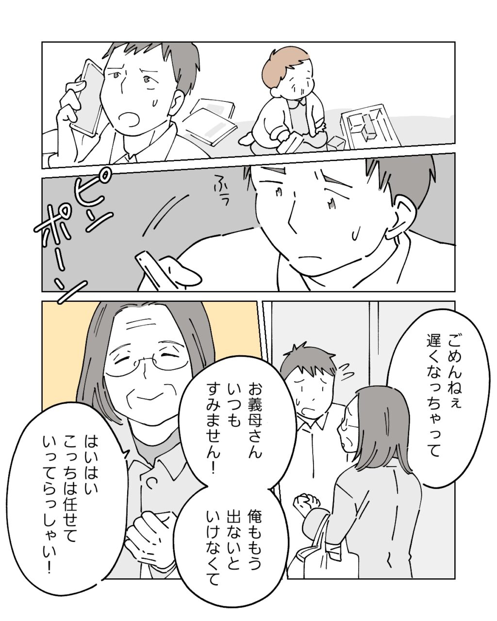 翔におもちゃで遊んでもらっている間に、俺は急いでクライアントへ電話をかけました。用件を終えて、ようやく一息ついたその時、ピンポーンと玄関のチャイムが鳴ります。「ごめんねぇ遅くなっちゃって」申し訳なさそうに頭を下げる義母に、「いつもすみません!でも俺もう出ないといけなくて・・・」と伝えると、義母は嫌な顔ひとつせず、「はいはい、こっちは任せていってらっしゃい!」と明るく送り出してくれました。