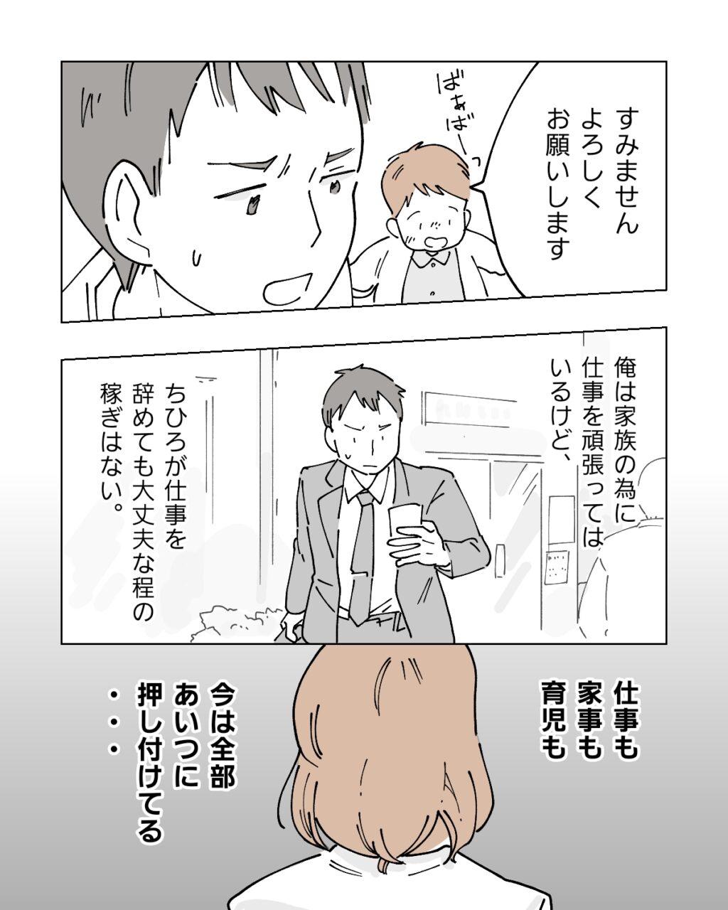 「すみません、よろしくお願いします」そう言って、急いで会社に向かいました。家族のために仕事を頑張ってはいるものの、ちひろが仕事を辞めても大丈夫なほどの稼ぎはありません。正直、今の俺は仕事も家事も育児も全部ちひろに押し付けています。