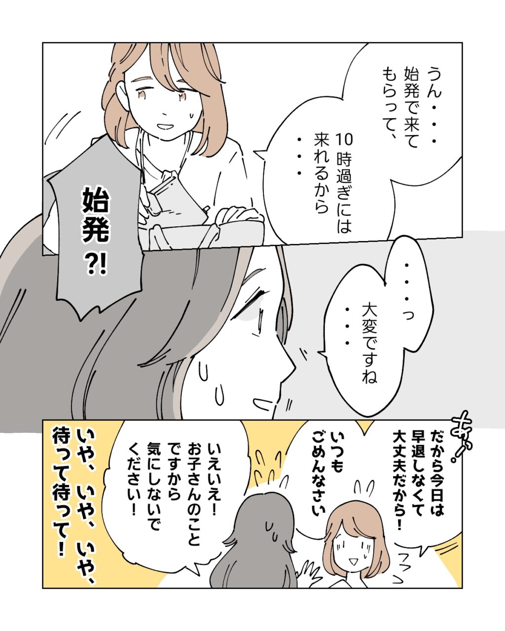 「始発で来てもらって、10時過ぎには来れるから・・・」と、気まずそうに説明する大宮さん。「始発!?」私は驚きのあまり、大宮さんを二度見します。すると何か勘違いしたのか、大宮さんは慌てた様子で「あっ!だから今日は早退しなくて大丈夫だから!いつもごめんなさい」と付け足しました。