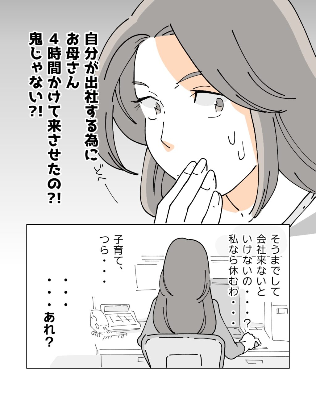 自分が出社するために、お母さんを4時間かけて家まで来させたの!?いくら子どもが熱を出して大変だからとはいえ、いくら何でも鬼すぎる・・・。そこまでして会社に来る必要はあるのでしょうか。私が大宮さんの立場なら迷わず休みを取ります。