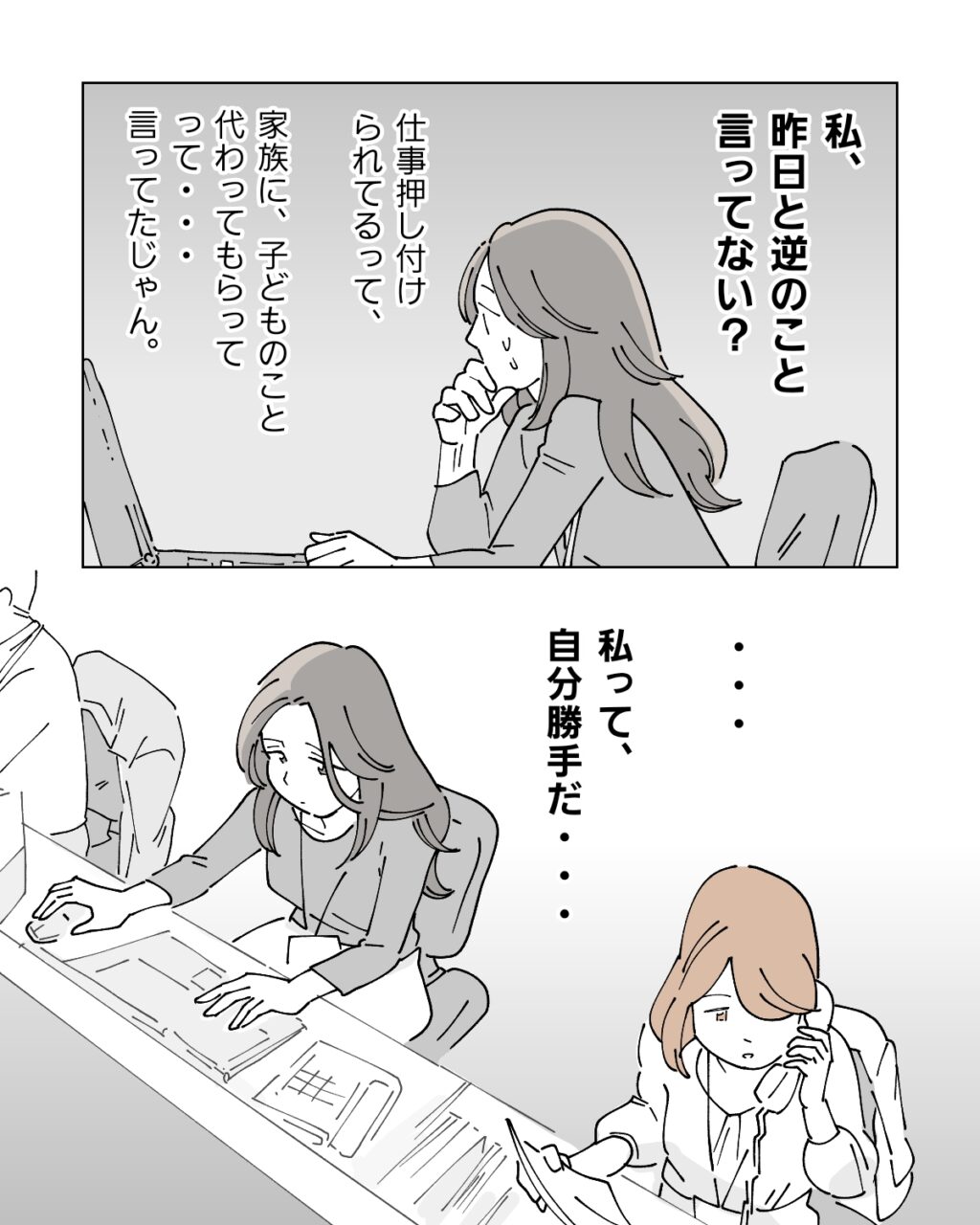 そのとき私は、自分が昨日と真逆のことを考えているのに気が付きました。昨日の自分は「家族に子どもの面倒を見てもらえばいい」そう思っていました。だけど、いざ大宮さんが自分の親を始発で来させるという強硬手段に出れば、「自分だったら休みを取る」って・・・。大宮さんにも事情があるのに、自分のことしか考えられない自分に嫌気がさしました。