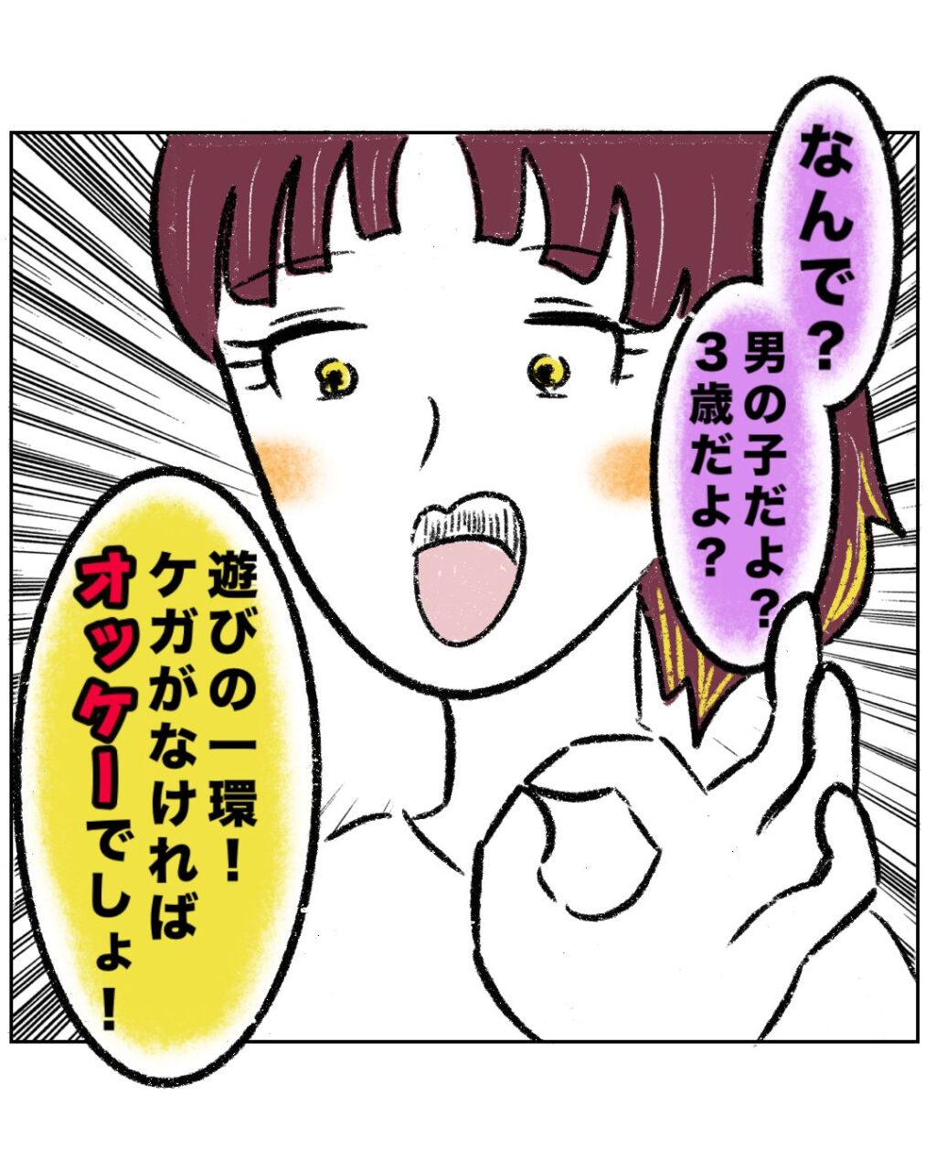 つーくんママは「なんで?男の子だよ?3歳だよ?遊びの一環!ケガがなければオッケーでしょ!」とあっけらかんと言い放ったのです。
