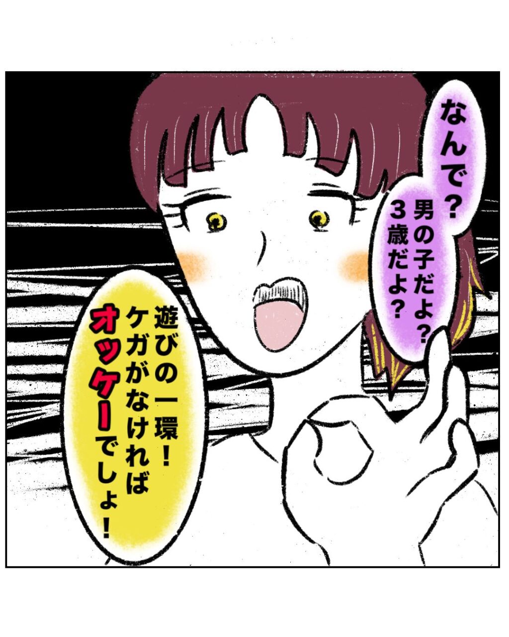 お友達のまーくんを叩いたつーくんを叱ることなく、叩かれたまーくんにやり返すようにけしかけるつーくんママにまるさんが「謝らせた方がいいと思う」と意見すると、つーくんママは「遊びの一環!ケガがなければオッケーでしょ!」とさらり。