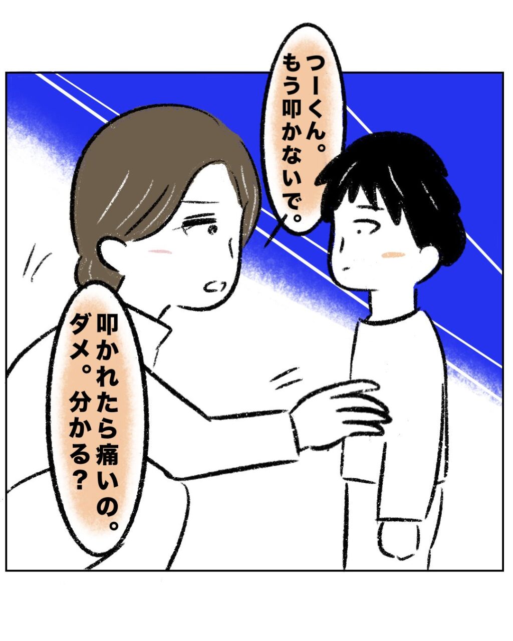 まーくんママはつーくんの元へ行くと、しゃがんで目線を合わせ「つーくん。もう叩かないで。叩かれたら痛いの。ダメ。分かる?」と冷静に諭すように話しました。
