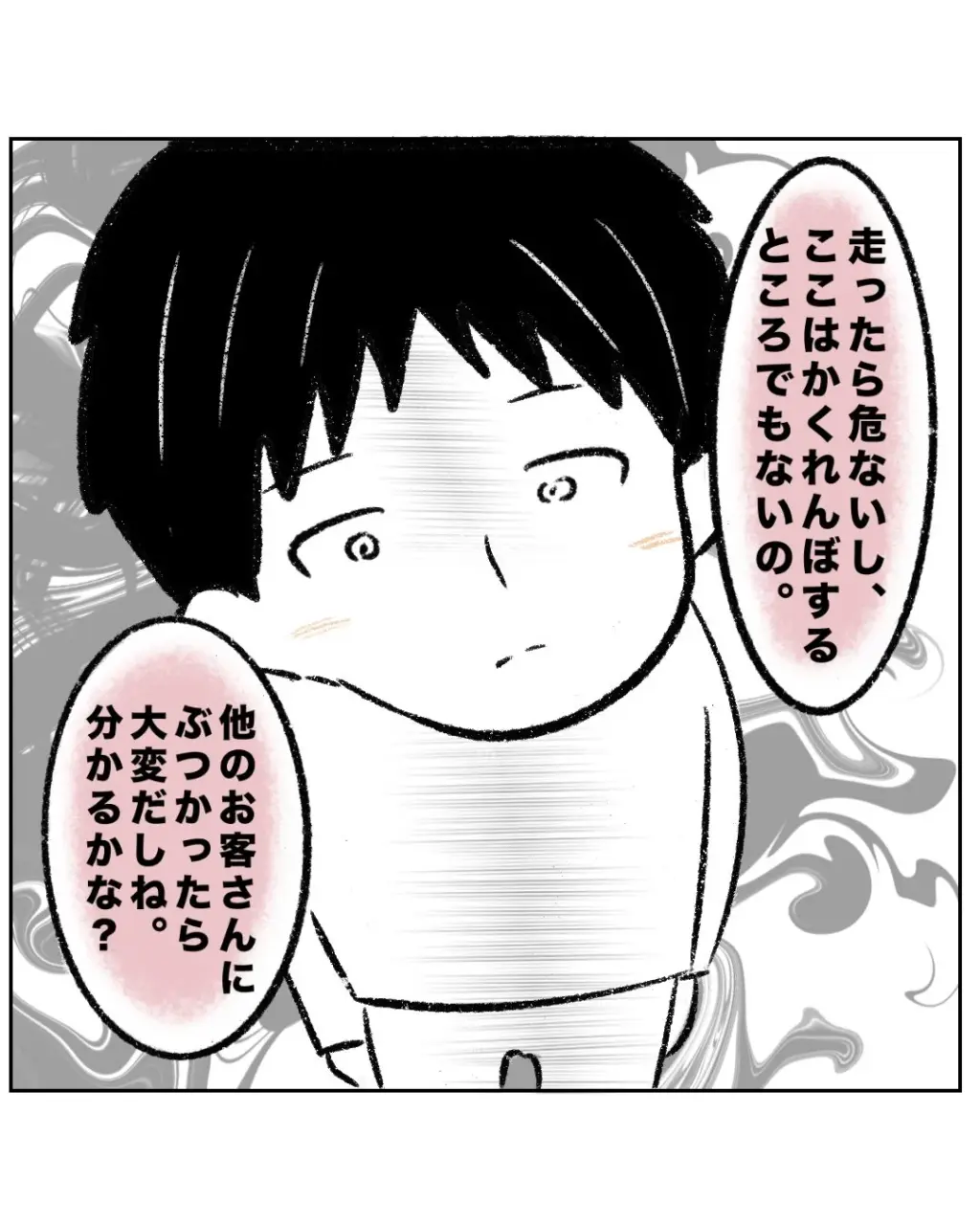 まるさんは黙っていられず「走ったら危ないし、ここはかくれんぼするところでもないの。ほかのお客さんにぶつかったら大変だしね。分かるかな?」とつーくんに話しました。