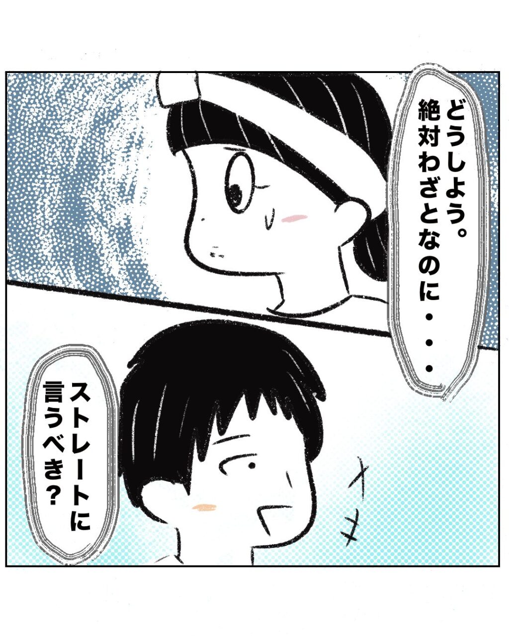 「どうしよう。絶対わざとなのに・・。ストレートに言うべき?」一部始終を見ていたまるさんは、つーくんがまーくんのハンカチを落としたのはわざとだと確信がありましたが、それを言うべきか迷います。