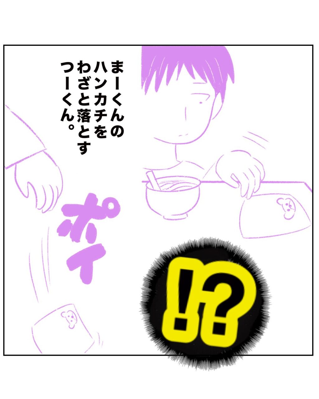 つーくんはテーブルに置いてあったまーくんのハンカチに手を伸ばすと、ポイッと床に落としました。