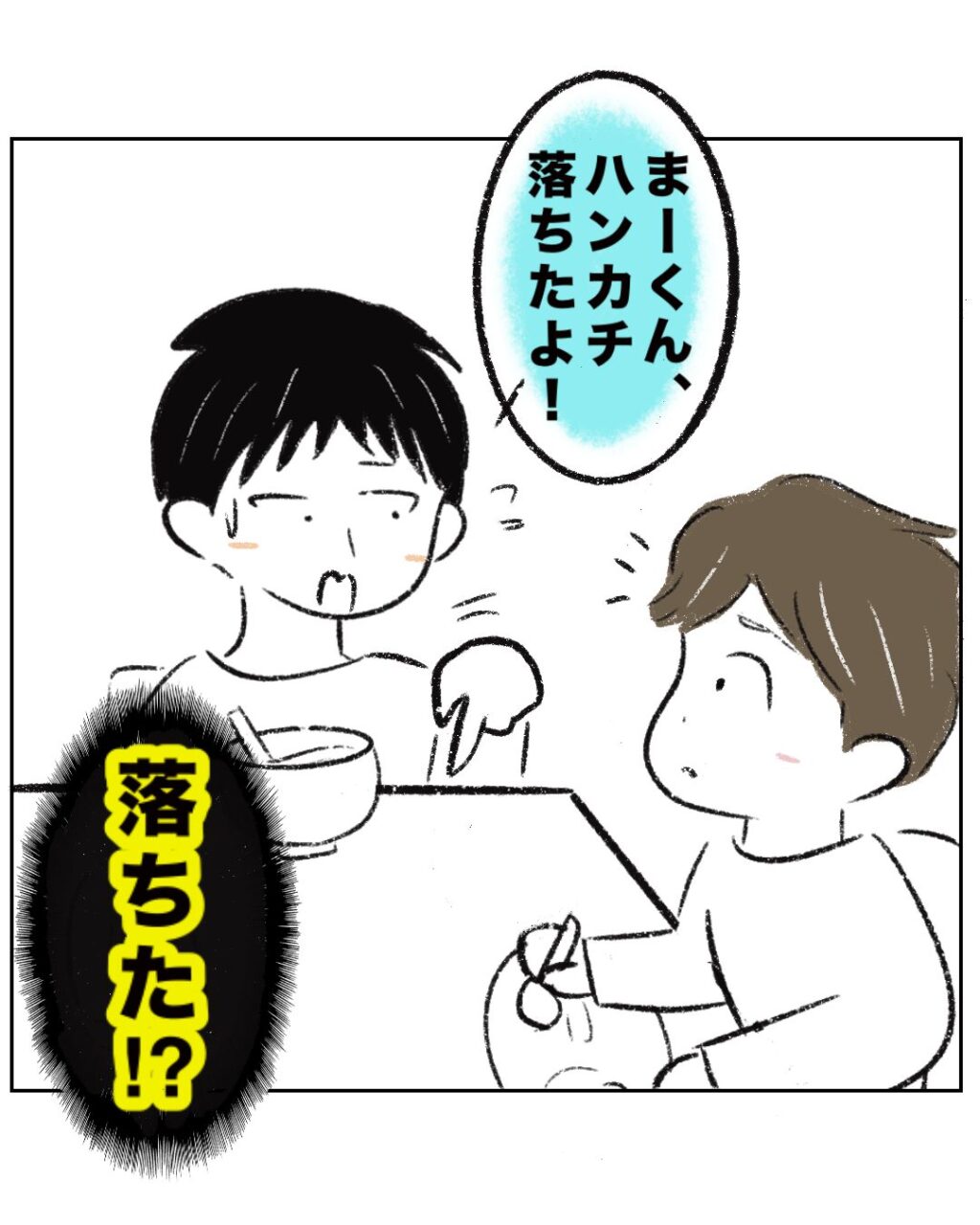 しかしすぐに「まーくん、ハンカチ落ちたよ!」と言って床を指差しました。つーくんの言葉にまるさんは「落ちた!?」とビックリ。