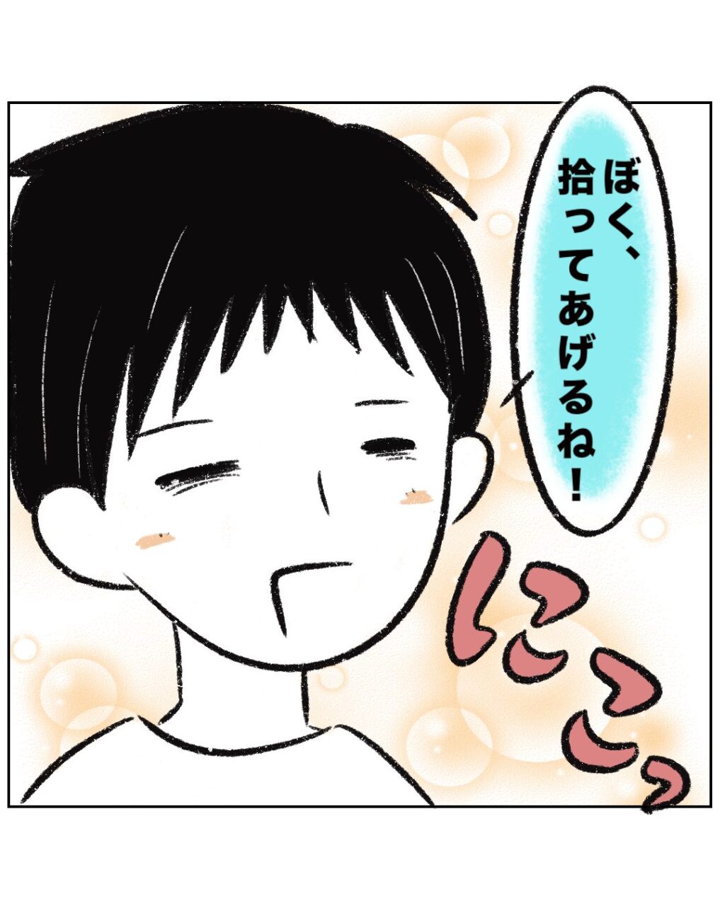 つーくんはにこっと笑うと「ぼく、拾ってあげるね!」と言って席を立ち、まーくんのハンカチを拾いました。