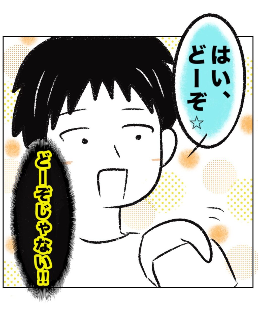 つーくんは床に落ちていたハンカチを拾うと「はい、どーぞ!」と笑顔でまーくんに手渡しました。