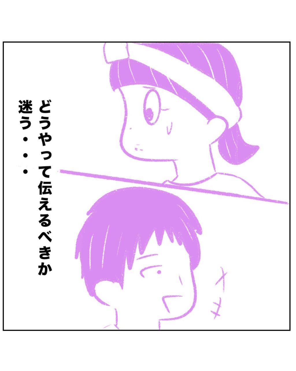 つーくんがまーくんのハンカチをわざと床に落とす瞬間を見ていたまるさんが思わず「あっ!」と声を出すと、つーくんはビクッとして一瞬気まずそうな表情をしました。しかし、つーくんはすぐに「まーくん、ハンカチ落ちたよ!ぼく、拾ってあげるね!」と、ハンカチを拾ってまーくんに渡しました。つーくんがわざとハンカチを落とすのを見ていたのはまるさんだけで、何も知らずにつーくんを微笑ましく見つめるつーくんママを見て、まるさんは「どうやって伝えるべきか迷う・・」と事実を伝えるべきか考え込んでいました。