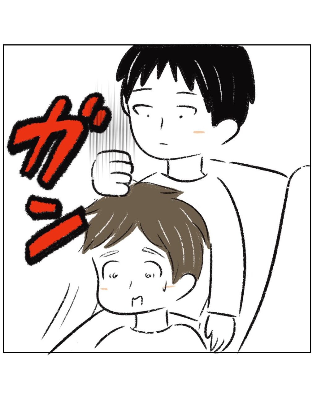 すると突然、ガン!!とつーくんがまーくんの頭にげんこつを!!びっくりしたまーくん!