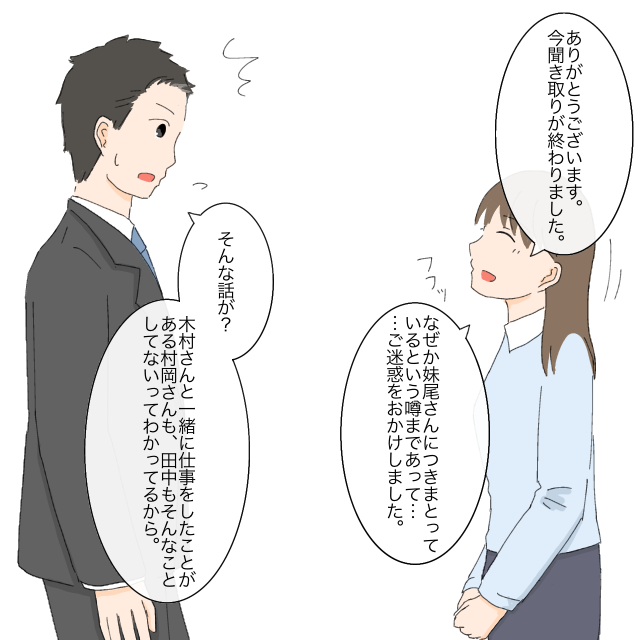 「ありがとうございます。今聞き取りが終わりました。なぜか、妹尾さんにつきまとっているという噂まであって・・ご迷惑をおかけしました」と謝ると、「そんな話が?木村さんと一緒に使途おをしたことがある村岡さんも、田中もそんなことしてないってわかってるから」と妹尾さん。