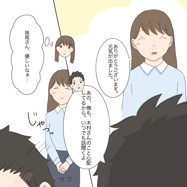 「ありがとうございます。元気が出ました」とお礼を言うと、「あの、俺も木村さんのこと心配してるから。いつでも話聞くよ」そう言われ、「妹尾さん、さすが優しいなぁ・・」と思っていると、素早く去って行ってしまった妹尾さんの頬が心なしか赤いような・・。