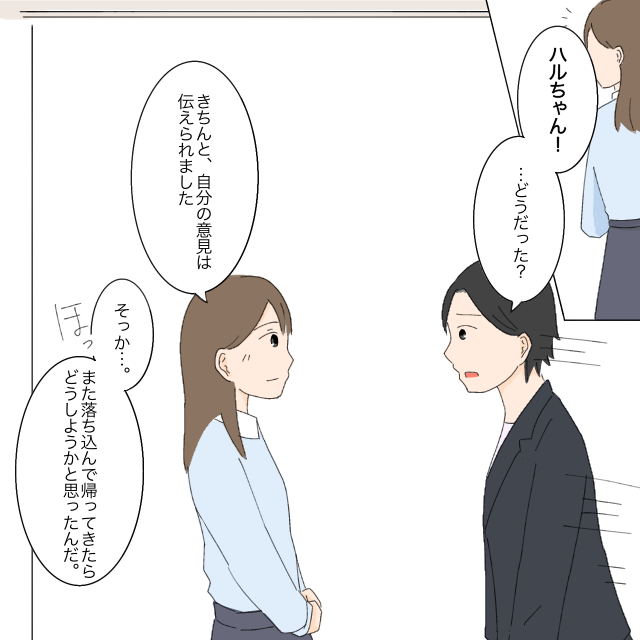 その後、部署に戻ると、「ハルちゃん!・・どうだった?」心配そうにたずねるともか先輩に、「きちんと、自分の意見は伝えられました」と答えると、「そっか・・。また落ち込んで帰ってきたらどうしようかと思ってたんだ」そうホッとしながら言いました。