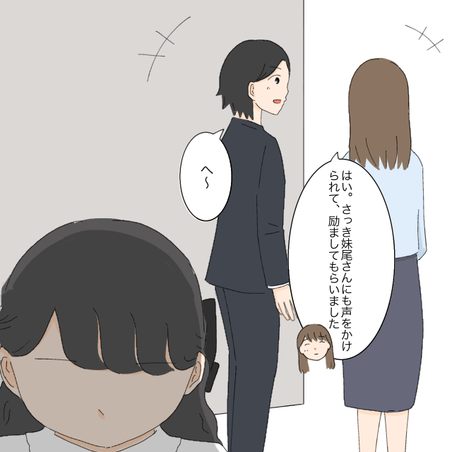 「はい。さっき妹尾さんにも声をかけられて、励ましてもらいました」と言う私の言葉に「へ~」と答えるともか先輩。そこから少し離れたところで、足立さんが私たちの話を聞いていたのでした。