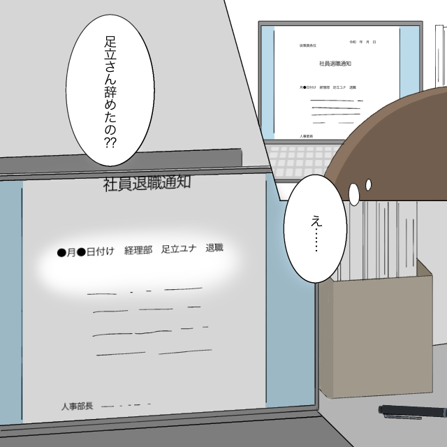 それから少しして、社内のパソコンに配信された「社員退職通知」を見て、「え・・足立さん辞めたの??」とビックリ。そこには確かに退職者として足立さんの名前が書かれていたのでした。