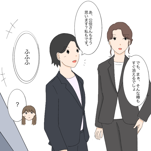 そして、「でも、まぁ、そんな噂もすぐ消えるでしょ」とキッパリ言う公佳さん。「あ、公佳さんもそう思います?私もです」ともか先輩までそう言い出し、「ふふふ」2人して笑う様子に私は訳がわかりませんでした。