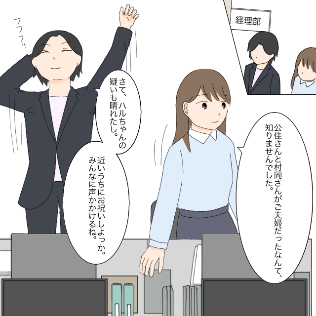 その後、部署に戻って「公佳さんと村岡さんがご夫婦だったなんて知りませんでした」とともか先輩に言うと、「さて、ハルちゃんの疑いも晴れたし。近いうちにお祝いしよっか。みんなに声かけるね。」と笑いながらともか先輩が言いました。