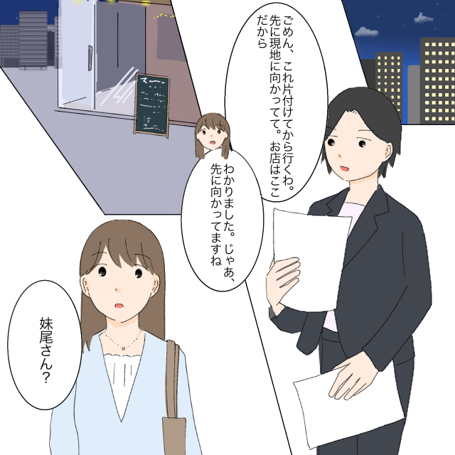 「ごめん、これ片付けてから行くわ。先に現地に向かってて。お店はここだから」ともか先輩に紙を渡されそう言われた私。「わかりました。じゃあ先に向かってますね」そう言って現地へ。