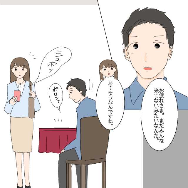 「お疲れさま。まだみんな来てないみたいなんだ」そう話す妹尾さんに、「あ・・そうなんですね」と答えていると、2人のスマホにメッセージが!