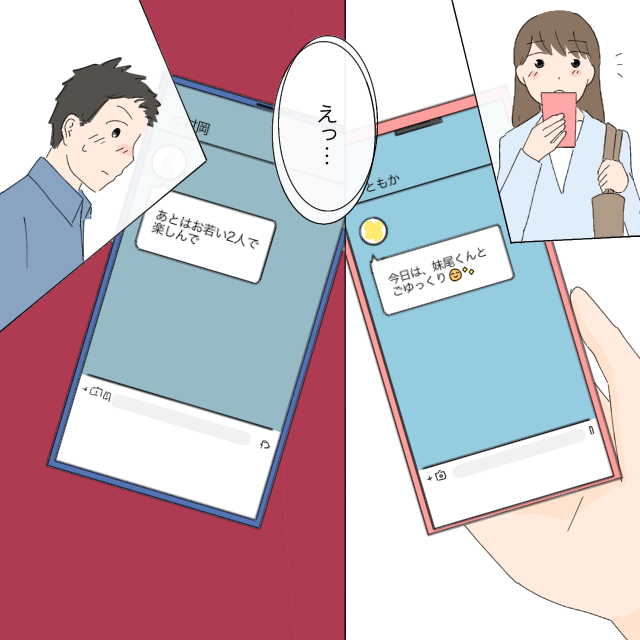 私には、「今日は、妹尾くんとごゆっくり」ともか先輩からメッセージが!妹尾さんには「あとはお若い2人で楽しんで」と村岡さんからメッセージが届いていて、「えっ・・」と2人揃って動揺してしまいました。