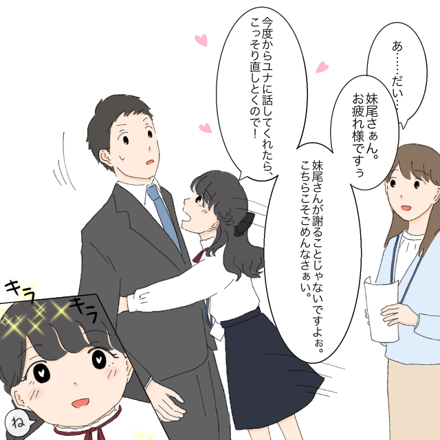 妹尾さん。「あ・・だい・・」私の言葉を遮って「妹尾さんが謝ることじゃないですよぉ。こちらこそごめんなさぁい。今度からユナに話してくれたら、こっそり直しておくので!」妹尾さんに抱きつき、目をキラキラさせながら足立さんが言うのを見て、