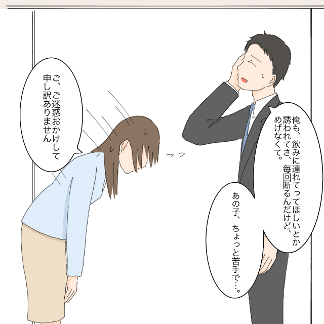 「俺も、飲みに連れてって欲しいとか誘われてさ、毎回断るんだけどめげなくて。あの子、ちょっと苦手で・・」困りながら言う妹尾さんに、「ご、ご迷惑おかけして申し訳ありません」と慌てて頭を下げました。