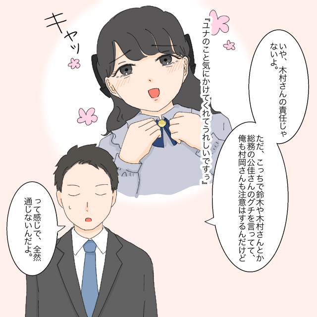 「いや、木村さんの責任じゃないよ。ただ、こっちで鈴木さんや木村さんとか、総務の公佳さんのグチを言ってて、俺も村岡さんも注意はするんだけど、『ユナのこと気にかけてくれてうれしいですぅ』って感じで、全然通じないんだよ・・」とドン引きしている妹尾さんの話を聞いて、