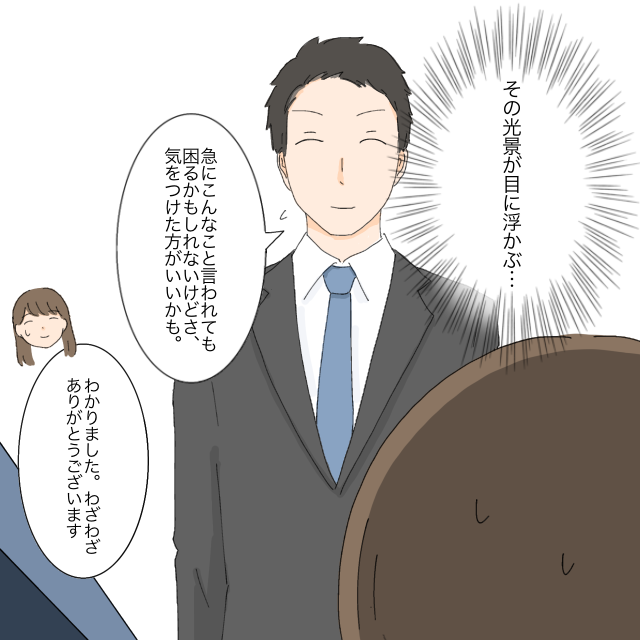 「その光景が目に浮かぶ・・」と心の中で呟くと、「急にこんなこと言われても困るかもしれないけどさ、気をつけた方がいいかも」妹尾さんの言葉に、「わかりました。わざわざありがとうございます」と返事をしながら、足立さんが営業部内であれこれ話している姿が目に浮かびました。