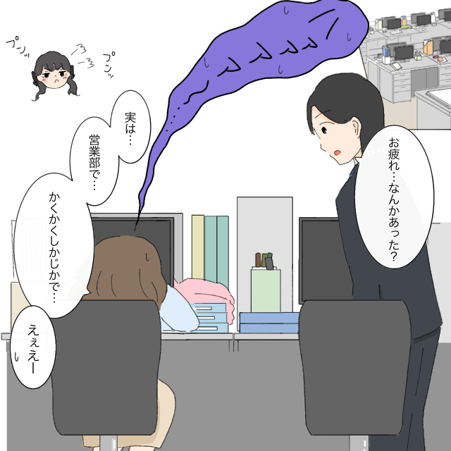 どっと疲れて部署に戻った私と、ご機嫌ななめの足立さんを見て「お疲れ・・なんかあった?」と、ともか先輩にたずねられ、「実は・・営業部で・・かくかくしかじかで・・」と言うと、「えぇえー」と驚いて、