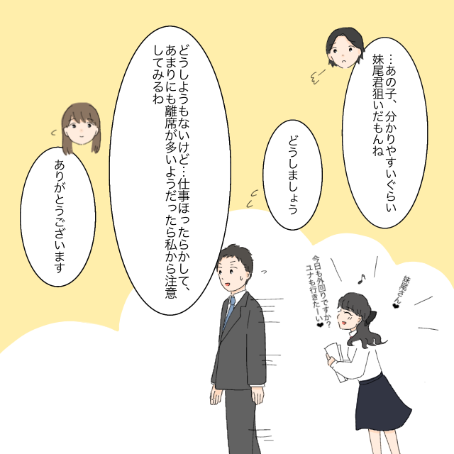 「・・あの子、わかりやすいぐらい妹尾くん狙いだもんね」と、ともか先輩も納得している様子。「どうしましょう」と言うと、「どうしようもないけど・・仕事ほったらかして、あまりにも離席が多いようだったら、私から注意してみるわ」ともか先輩の言葉に、「ありがとうございます」とホッとしてお礼を言いました。