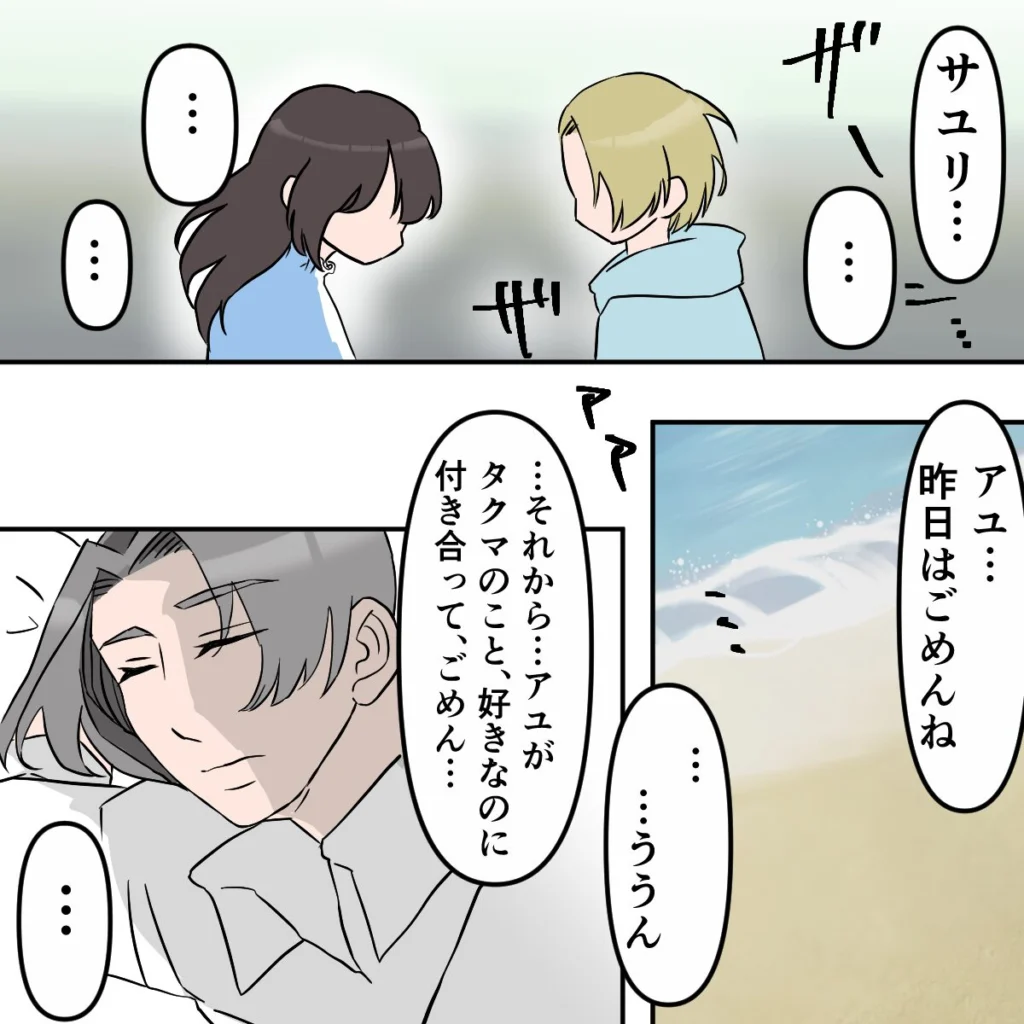 すると、「アユ・・昨日はごめんね」サユリにそう言われ、「・・ううん」そう答えると、「・・それから・・アユがタクマのこと、好きなのに付き合って、ごめん・・」サユリの言葉を聞いてすぐには何も言えなかった私に、