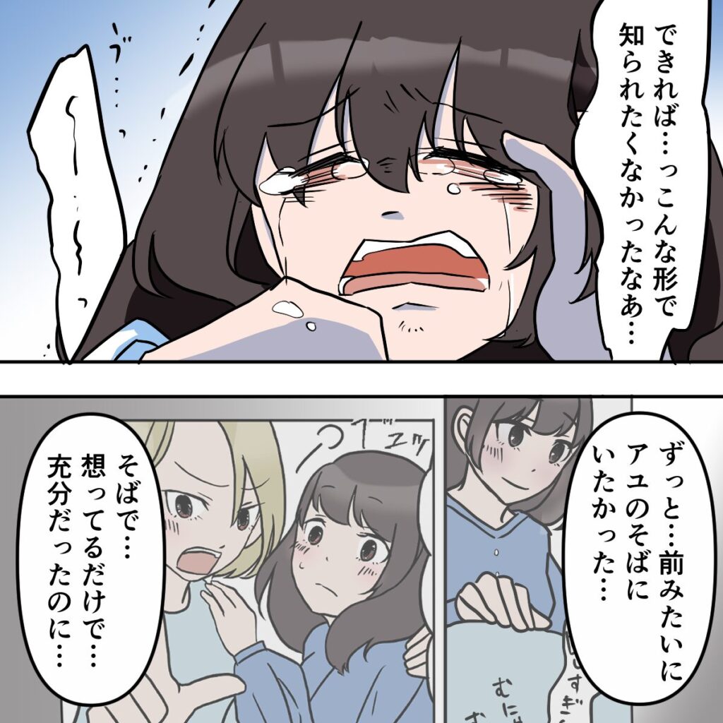 「できれば・・っ。こんな形で知られたくなかったなあ・・」涙を流しながらそう話すサユリ。「ずっと・・前みたいにアユのそばにいたかった・・そばで・・想ってるだけで・・充分だったのに・・」そう言われて、