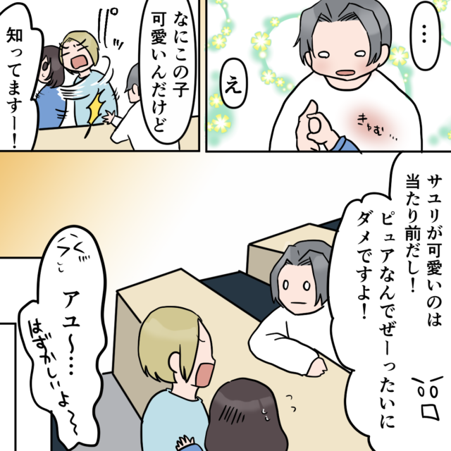タクマさんが自己紹介した後、握手しようと手を差し出すと、指先だけをちょこんと握り「・・よろしくお願いします」と言うサユリさんを見て、「なに子の子、可愛いんだけど」とほんわかするタクマさん、すると「知ってます!」と即答するアユさんは、「サユリが可愛いのは当たり前だど)ピュアなんでぜーったいにダメですよ!」と言い、それを隣で聞いていたあゆみさんは、「アユ~・・はずかしいよ~」とて赤面しました」