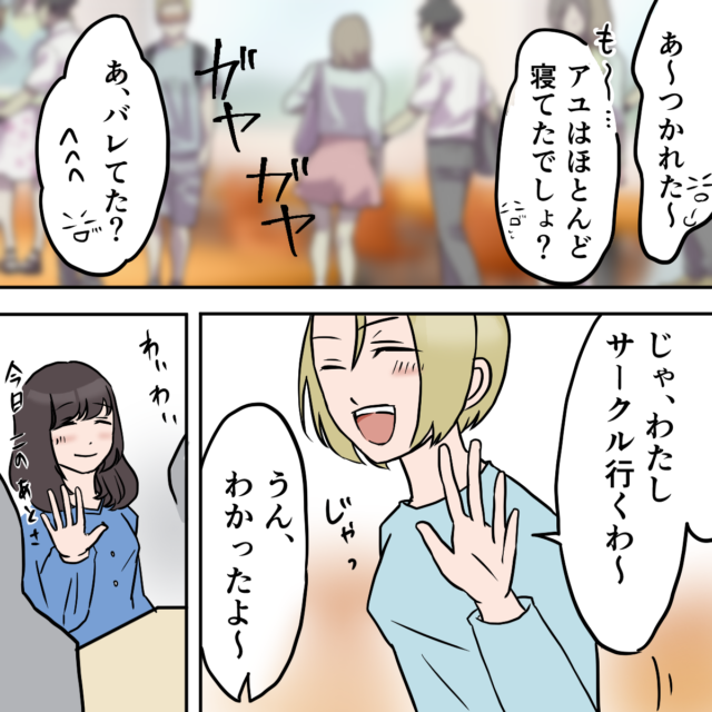 その後、授業が終わり、「あ~疲れた~」と言うアユさんに「アユはほとんで寝てたでしょ?」とサユリさん「あ、バレてた?」と言った後、「じゃ、わたそサークル行くわ~」と言うアユさんに、サユリさんは「うん、わかったよ~」と手を振って別れました。