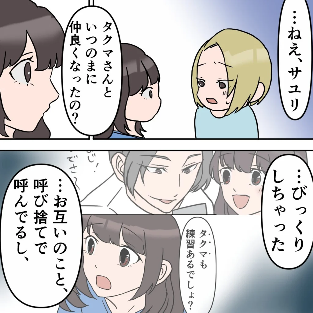 2人が距離を縮めたきっかけが気になった私は、思い切ってサユリに聞いてみることにしました。「・・・ねぇサユリ、タクマさんといつのまに仲良くなったの?お互いのこと呼び捨てで呼んでるし、びっくりしちゃった」そう言うと、サユリはきょとんとした顔で私を見つめます。