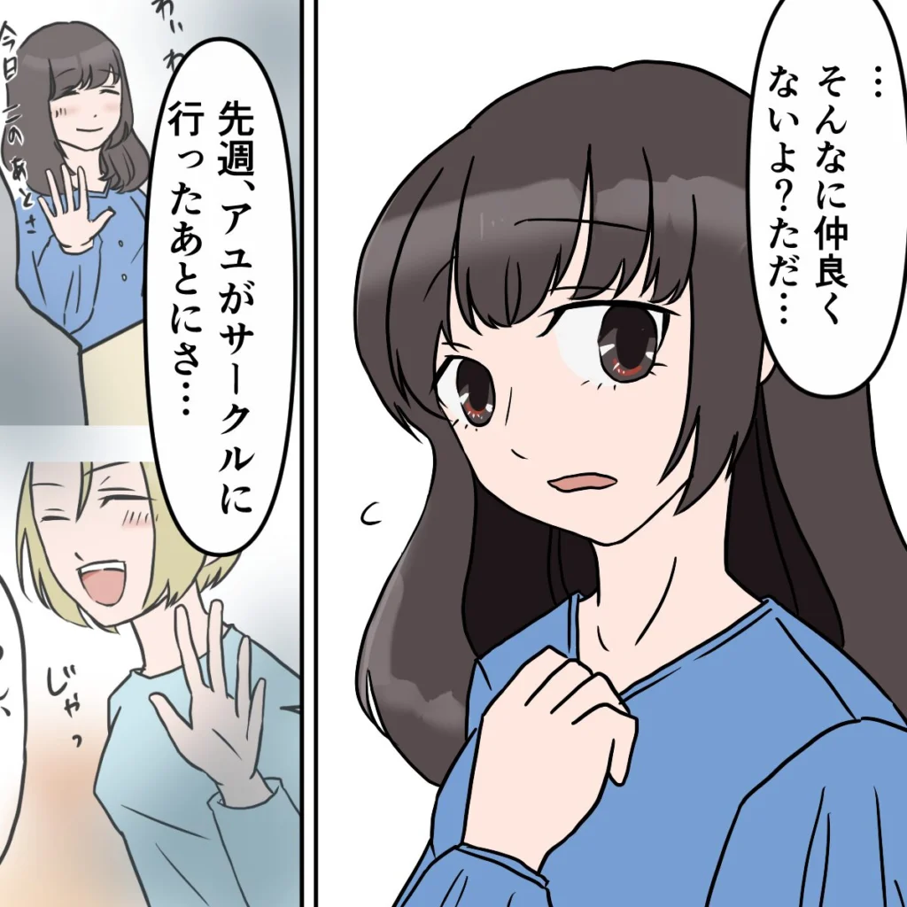 サユリは不思議そうに首をかしげると「そんなに仲良くないよ?ただ、先週アユがサークルに行ったあとにさ・・・」と、事の経緯を話し始めました。